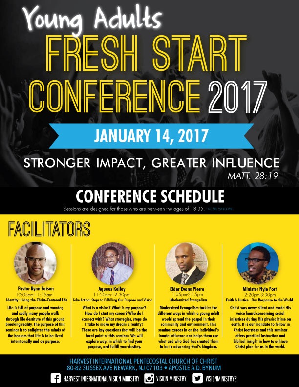 As we quickly march into 2017, I’m super excited to announce that I have been booked for my first official public speaking engagement at the 2017 Young Adults Fresh Start Conference. The Fresh Start conference will take place on Saturday January 14, 2017 from 9:30 am to 4:00 pm at the Harvest International Pentecostal Church of Christ in Newark, NJ. I am honored to be speaking alongside of Pastor Ryan Faison, Elder Evans Pierre, and Minister Nyle Fort.